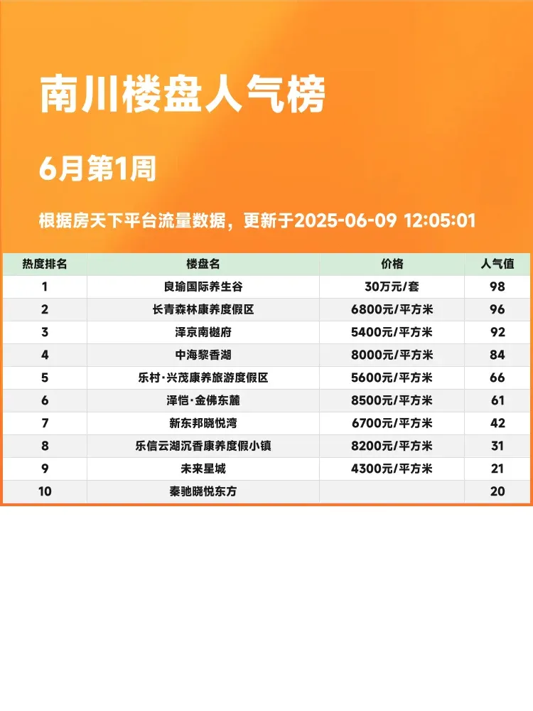 买房选房看榜单!🔥南川最新人气楼盘排行来啦~这份榜单真实反映市场热度,帮你快速锁定优质房源!当前市场下,性价比+配套+户型是买房三大关键,这份榜单正好给你最直观的参考✨