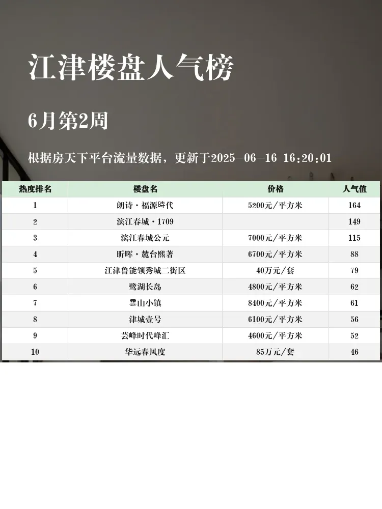 买房选对楼盘太重要啦!🔥当前市场下,地段+配套+性价比才是王道~这份江津人气楼盘榜单,帮你快速锁定优质房源,省时省力不踩雷!💪一起来看看TOP3都有哪些实力选手吧👇