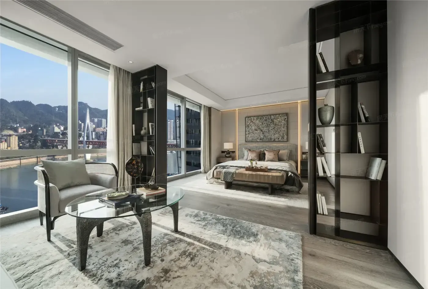 上次见Luna还是在外滩画廊,如今她带着乌拉圭艺术家的64件作品空降朝天阁。端着咖啡倚在落地窗前,嘉陵江与长江的交汇处正上演着金色航道与都市霓虹的碰撞。"展览结束前必须住进这栋楼"她掏出手机给我看刚拍的晚霞,270°环幕落地窗把重庆折叠成流动的立体画。