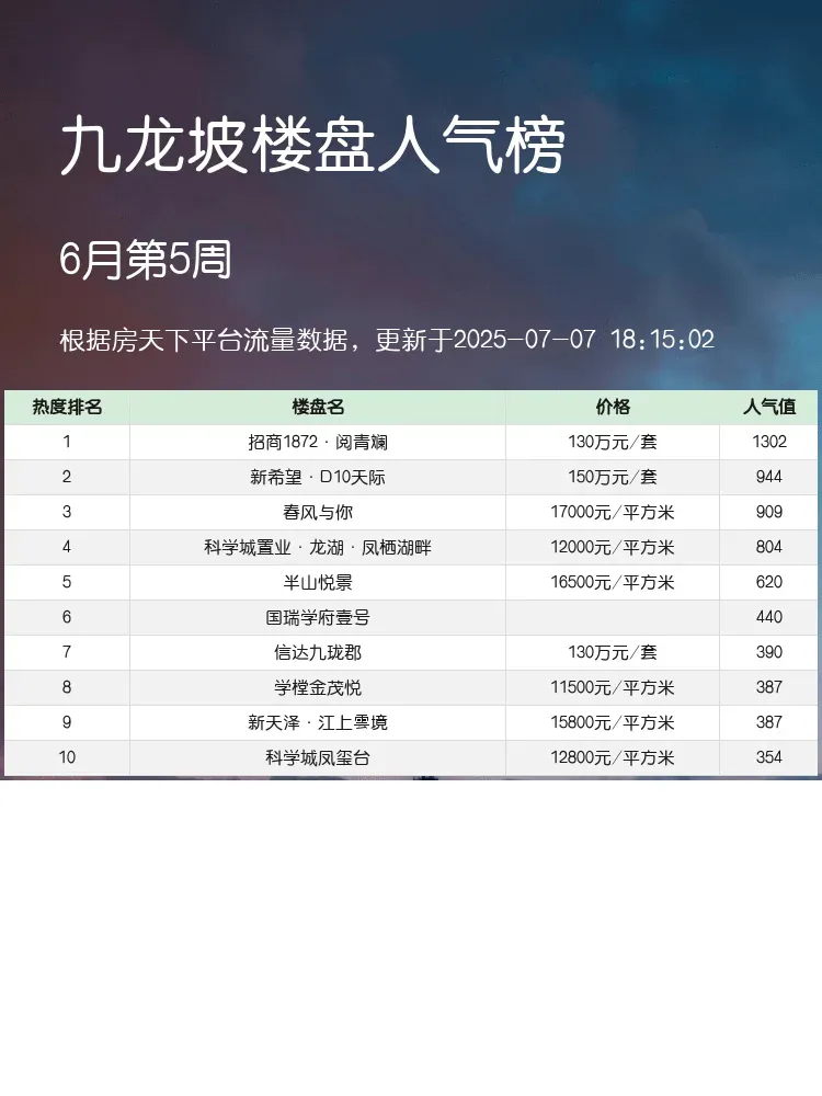 买房选房看榜单准没错!🔥九龙坡作为重庆热门置业区域,人气楼盘榜单能直观反映市场真实热度。当前市场下,交通便利、配套成熟、户型实用的楼盘更受青睐,这份榜单为你精选出真正值得关注的优质项目~