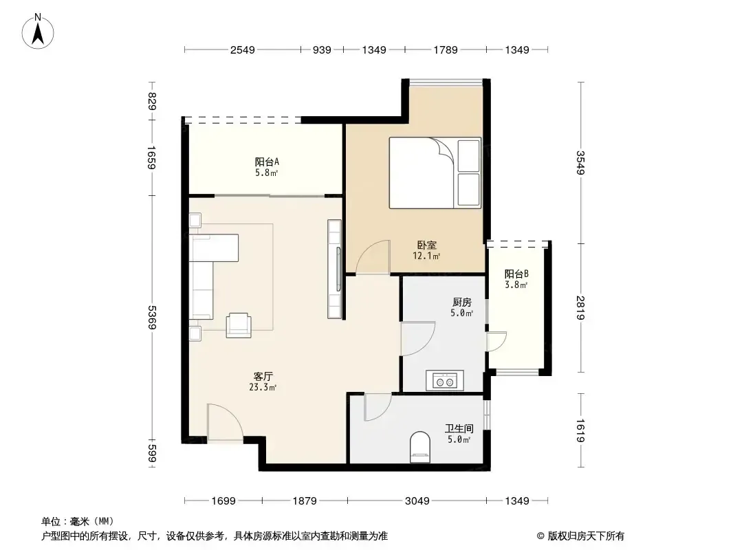 户型是1室1厅1厨1卫1阳台,南北朝向