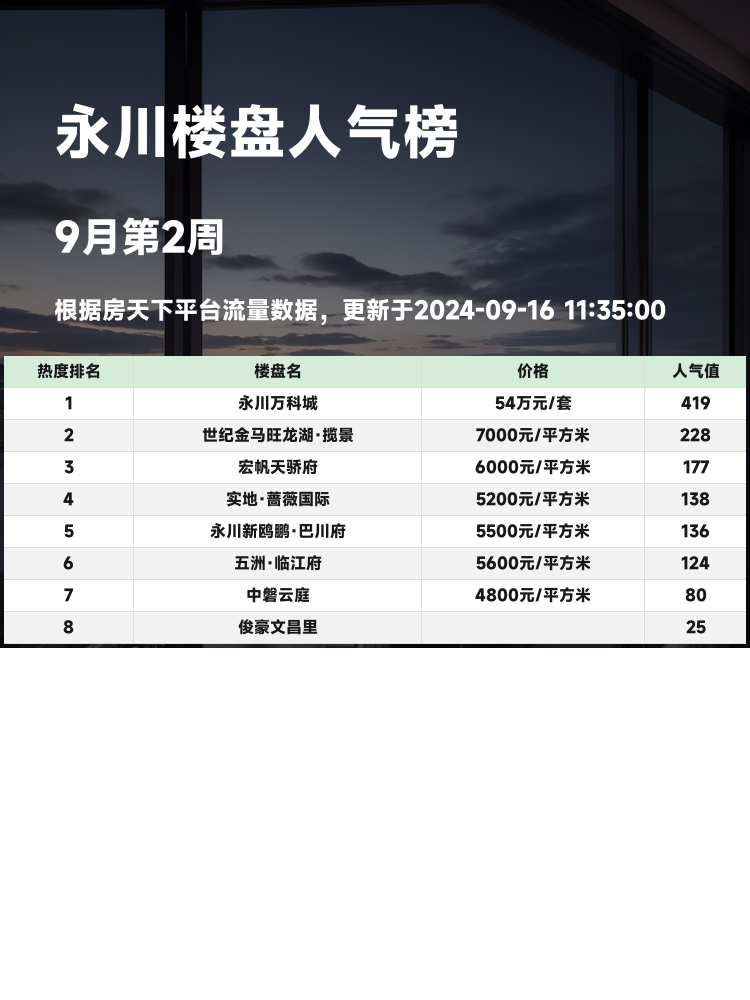 🏡在如今的房地产市场中,选房买房不再只是看价格和地段了。👀购房者更加关注的是配套设施、交通便捷性、教育资源等多方因素。大家都希望能够找到一个既适合居住,又具备增值潜力的好房子。为此,我为大家整理了永川地区的人气楼盘榜单,帮助大家更好地做出购房选择。👇