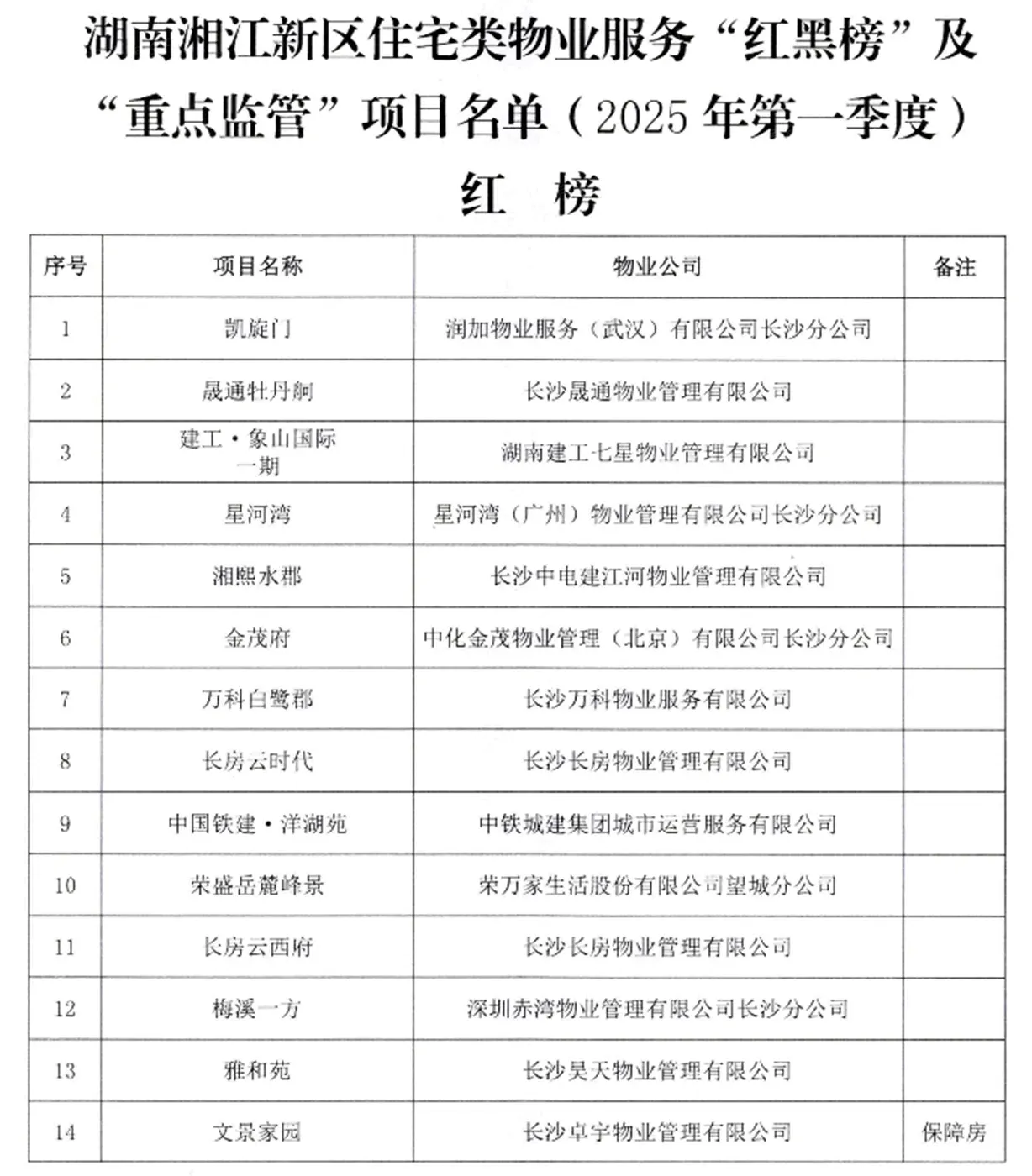 近日,湖南湘江新区召开2025年第一季度物业服务质量考核讲评会,现场公布第一季度物业项目“红黑榜”及“重点监管”企业名单,共有14家物业企业列入“红榜”,10家物业企业列入“重点监管”范围,3家物业企业列入“黑榜”。