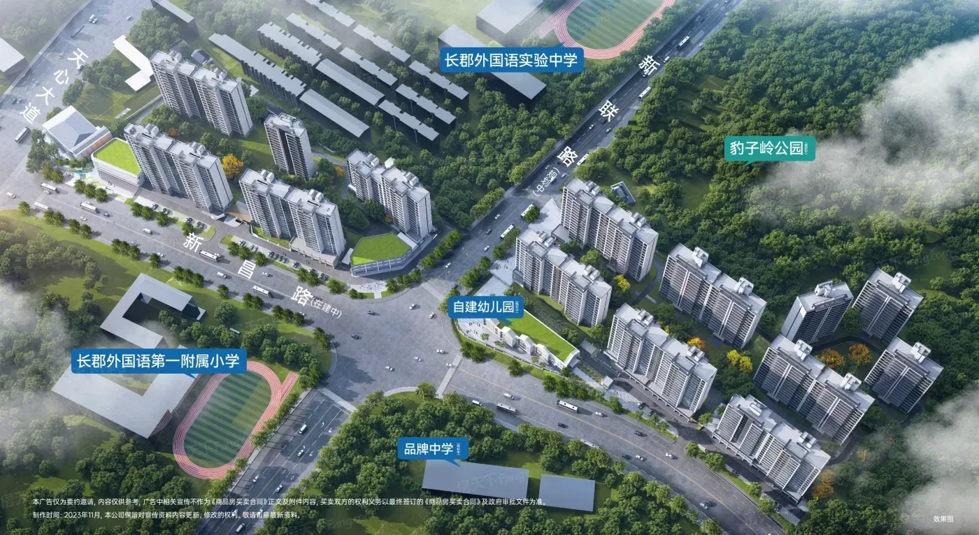 项目核心价值体现在三个方面。教育配套方面,与长郡外国语实验中学直线距离约300米,内部规划幼儿园实现全龄教育覆盖。社区规划方面,2.37容积率配合"十字轴"园林布局,中央景观带达40米宽度。开发保障方面,由中建五局旗下企业开发,工程进度透明且资金受监管,预计2026年底交付。