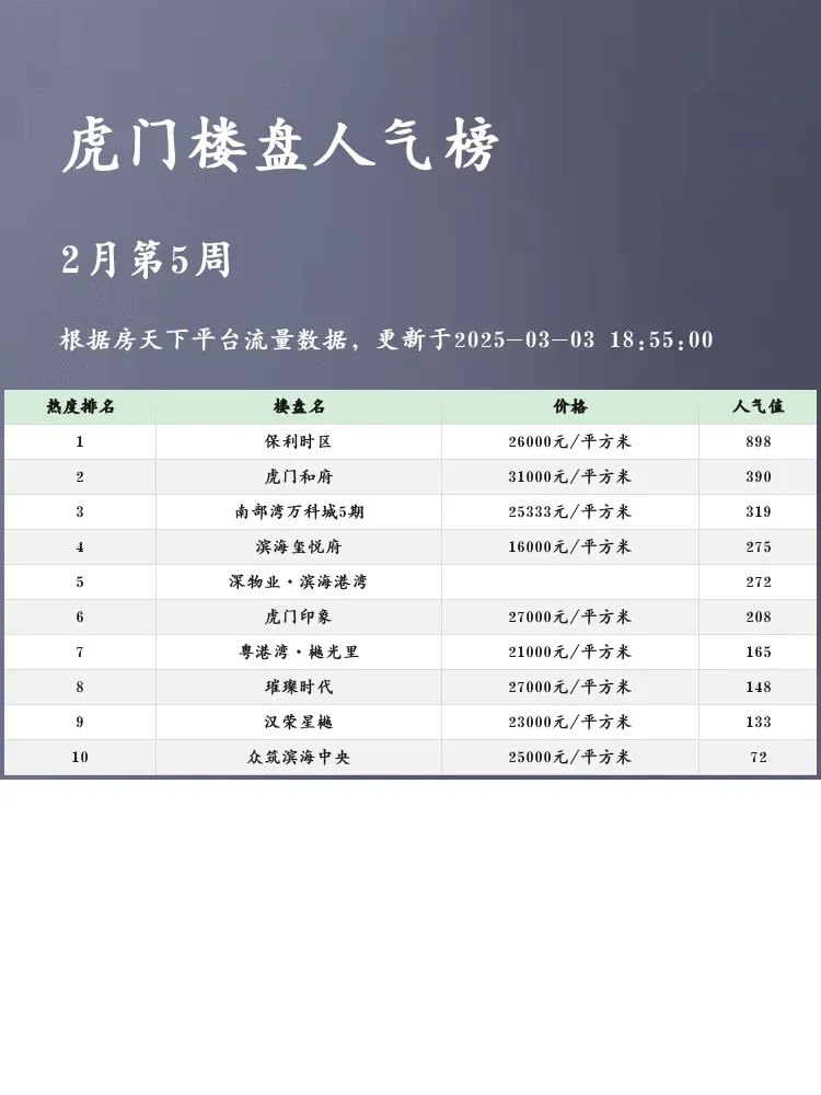 在买房这件事上,选对区域和楼盘至关重要!🏡 虎门作为滨海湾新区的热门板块,近期楼市热度持续攀升。这份人气楼盘榜单,帮你快速锁定优质房源,避开选房雷区,轻松找到心仪的家!✨