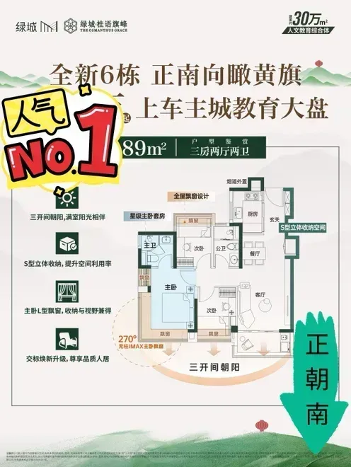 89平朝正南向的三房,看国贸看旗峰山红灯笼,妥妥的低总价高配置