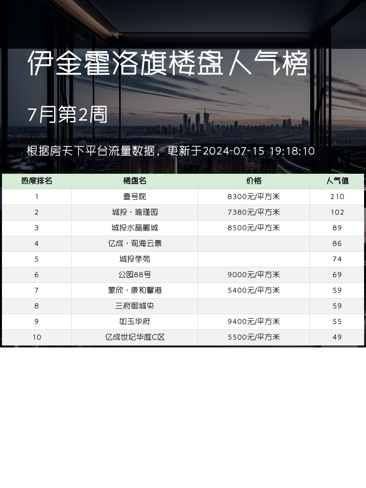 在当前复杂的楼市环境中,如何选到理想的楼盘成了购房者们共同面临的难题。而人气楼盘榜单正是购房者们选房的得力依据。今天给大家分享的是伊金霍洛旗的人气楼盘榜前三名,帮助你们更好地了解市场,做出明智的选择!📊🏠