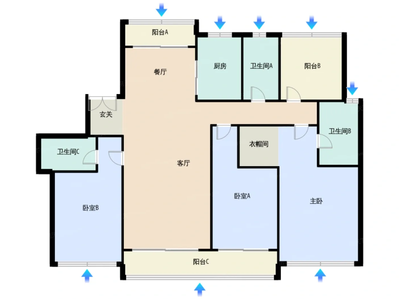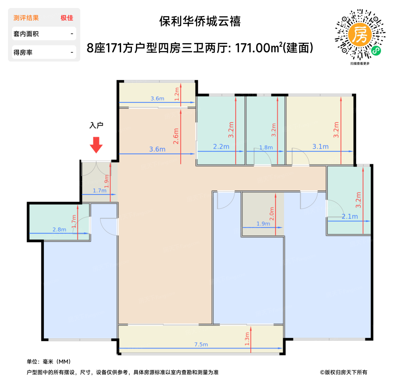 建面143㎡做到了双套房设计,主卧和老人房互不干扰。但次卫做了钻石型淋浴间,实测转身会蹭到玻璃门,这点大个子买家要注意。