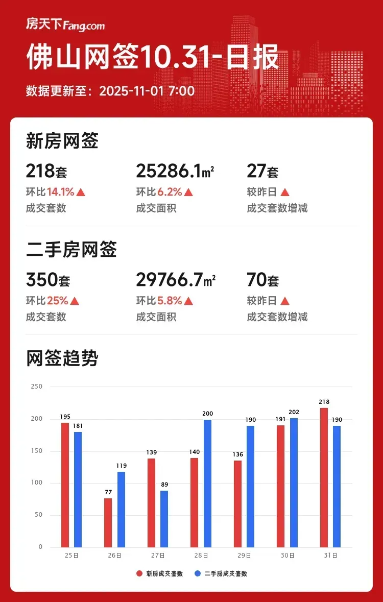 📈佛山新房住宅成交218套,较昨日增加27套,环比上涨14.1%;