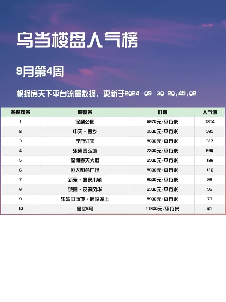 📈 在当前的房产市场中,了解人气楼盘的排名是非常有帮助的。🏡 买房不仅仅是选择一个居住地,更是对生活质量的一种投资。了解楼盘的优缺点,了解周边配套设施,关注价格和户型的合理性,都是购房者需要考虑的核心因素。今天为大家带来乌当区域的人气楼盘榜单,让你选房不再迷茫!