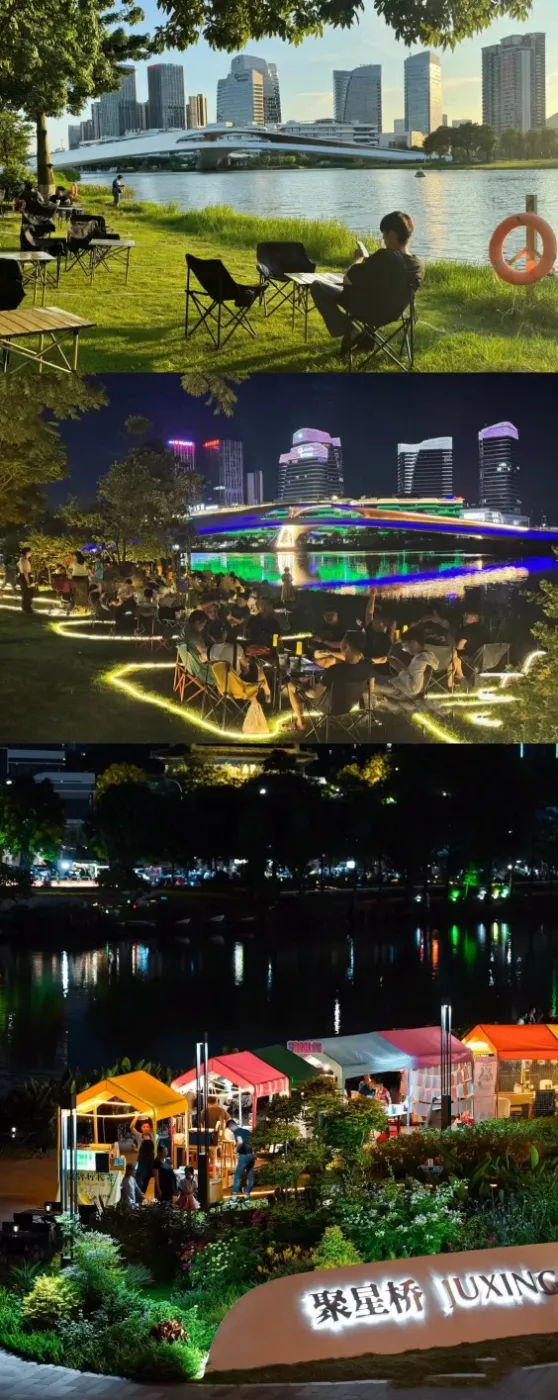 宝子们,在城市中发现了一处超治愈的地方!湖边的草坪上摆满了露营椅,傍晚时分,坐在这儿吹着微风,太惬意啦。(ノ>ω<)ノ♫♪
