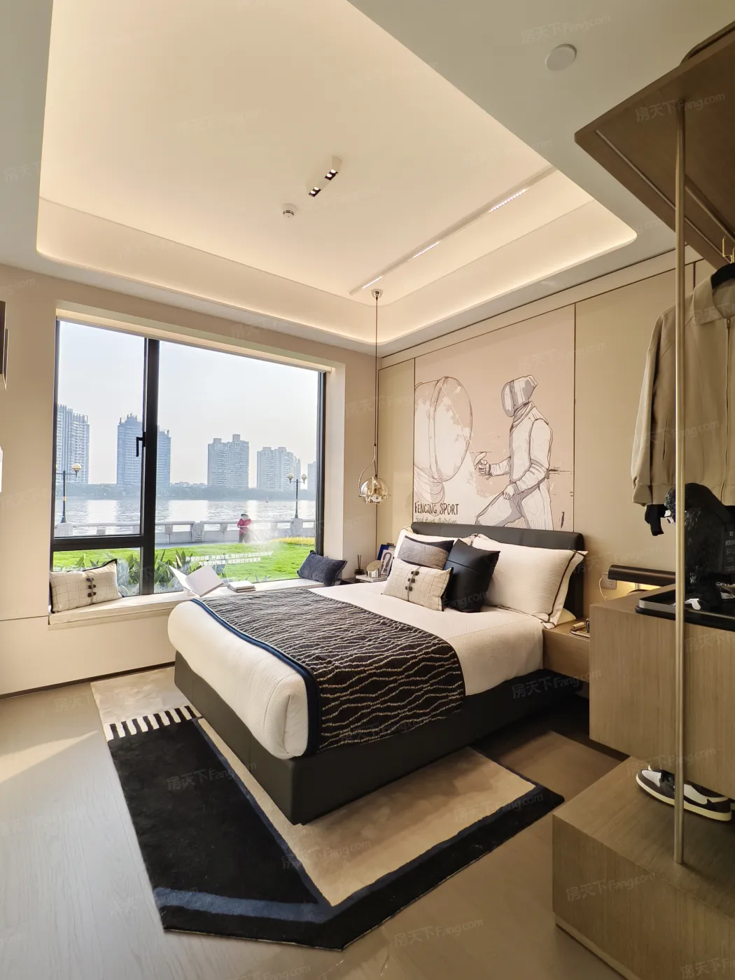 最绝的是客厅那组270°L型窗!晴天是波光粼粼的滤镜,雨天变成蒙着水雾的电影幕布。开发商居然把20cm超窄边框做到极限,站在窗前真的会有漂浮在江面上的错觉。