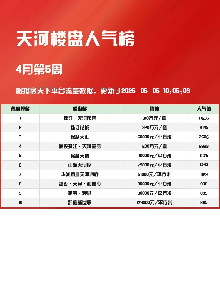 买房选房可不能盲目跟风🚫这份天河区人气楼盘榜单帮你精准避坑!当前市场下,交通便利、教育资源丰富、户型实用的楼盘更受追捧,这份榜单正是基于真实市场热度整理而成,快来看看有没有你的心动选项💓