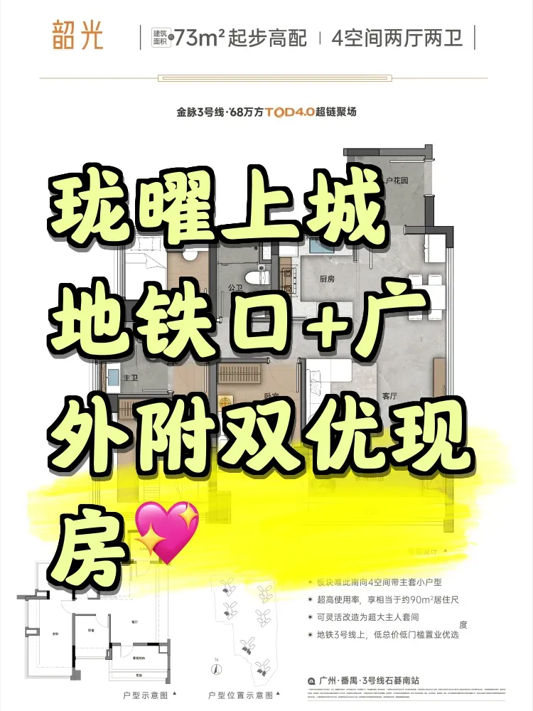 ①TOD通勤魔法:石碁南站D口步行5分钟,实测早高峰比住天河快8分钟。73㎡三房户型塞进独立玄关+U型厨房,3米层高吊顶后还能做整墙书柜,咖啡机旁种绿植的操作太戳年轻人!