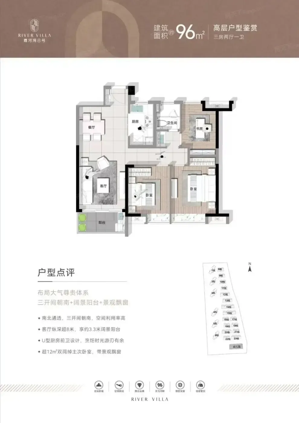 容积率2.1+板楼设计堪称降维打击,同板块竞品容积率都在3.0+。举个栗子:96㎡三房主卧居然有12.8㎡,比某些塔楼盘的客厅还宽敞!