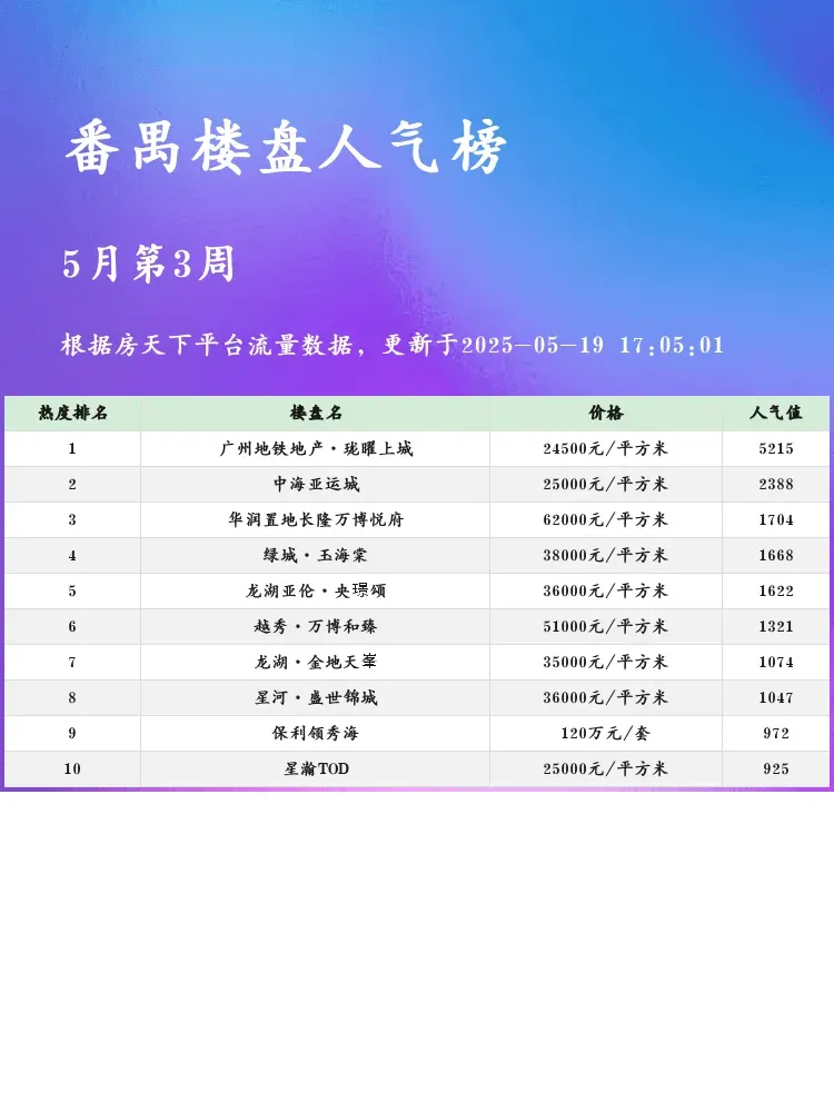 买房选对区域很重要,但同区域内楼盘差异也不小!这份番禺人气榜单帮你快速锁定优质盘💯 当前市场下,地铁+教育+户型是购房三大黄金法则,快来看看这些盘是否符合你的需求吧✨