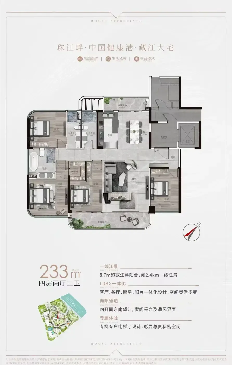 先说肉眼可见的优势:一线临江+全南向设计,每个户型都配7米起步的景观阳台。233㎡四房双主卧设计,主卫浴缸正对珠江,这种尺度感在广州核心区确实少见。装修标准也够硬核,全屋大金空调+汉斯格雅卫浴,吊顶预埋了音响线路。