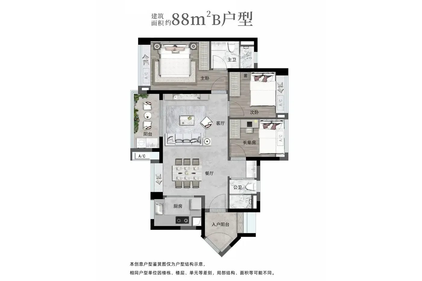 2️⃣【户型教科书】88㎡能做三房两卫,飘窗全送+横厅设计,主卧3.4米面宽吊打同级。115㎡四房带6米江景阳台,得房率超83%,这尺度在市区得叫"改善户型"。
