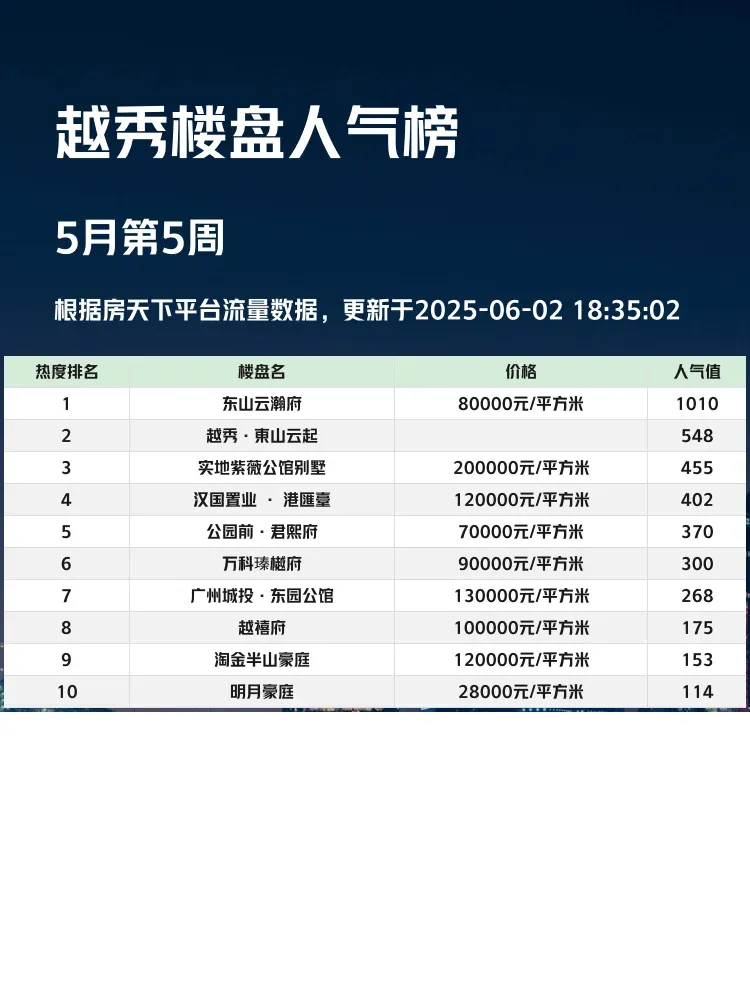 买房选对区域很重要,但同区域内楼盘差异也不小!人气榜单能直观反映市场热度,帮我们快速锁定优质盘🏆 当前市场下,核心地段+优质配套+合理户型才是硬道理,这份越秀区TOP3楼盘测评请收好👇