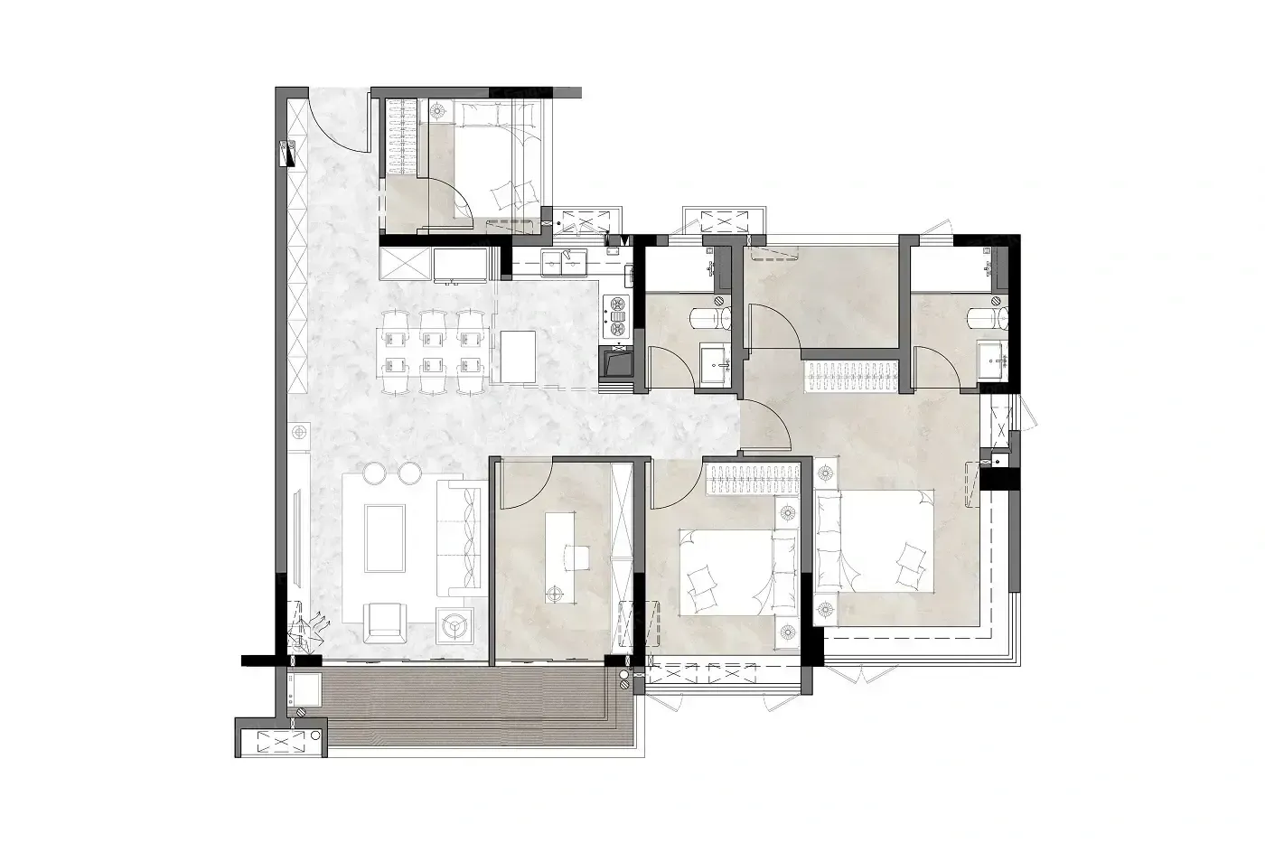 更戳中新世代家庭的是「LDKG魔方户型」:当厨房中岛台和客厅形成洄游动线,妈妈在开放式厨房煮咖啡,爸爸在客厅陪孩子拼乐高,转身递杯子的距离刚好能对视微笑。这种7.5米南向大阳台设计的妙处,是让穿堂风带着火炉山森林的绿意撞个满怀。