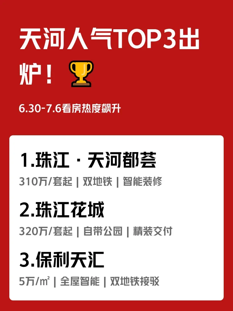 天河区上周(6.30-7.6)看房热度飙升🔥前三名楼盘总评分超9000!每天辗转3条地铁线通勤 vs 下楼直达商圈,你会怎么选?快看人气爆款楼盘测评↓