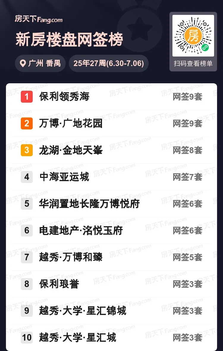 上周番禺楼市上演精彩对决,保利领秀海与万博·广地花园同揽9套网签并列榜首,龙湖金地天峯以8套紧随其后。中海亚运城、华润置地长博悦府等改善型项目持续走俏,前十榜单中半数项目周成交保持5套以上。值得关注的是,万博板块三盘同时上榜,板块热度可见一斑。