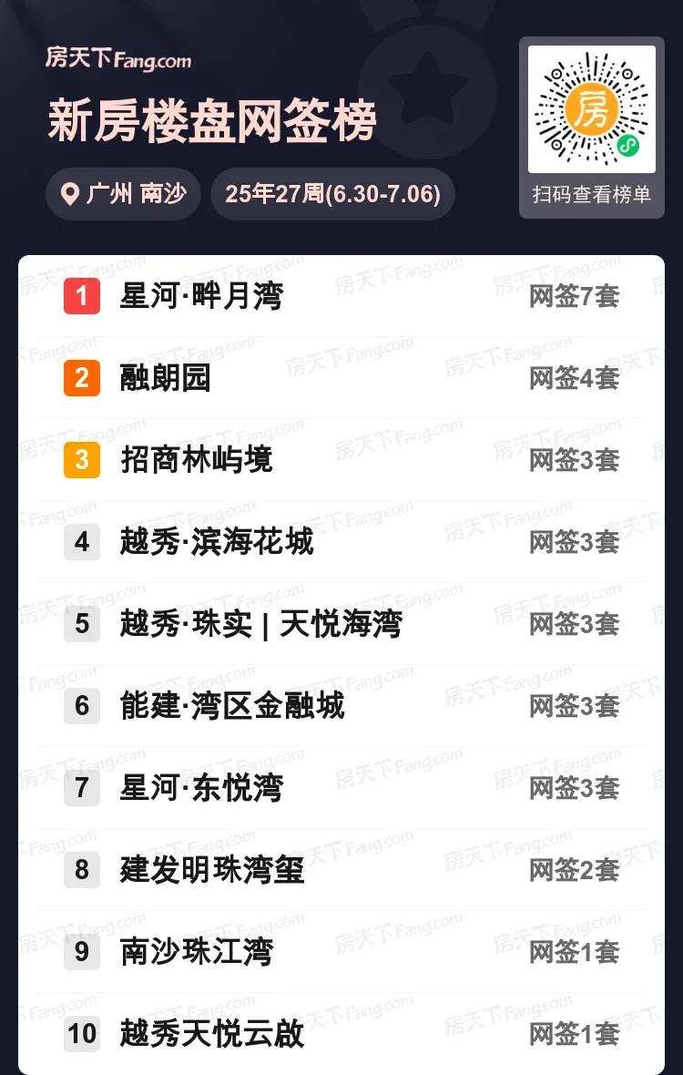 上周南沙新房市场谁最火?星河·畔月湾以7套成交强势占据榜首!融朗园4套紧随其后,招商林屿境、越秀·滨海花城等6个楼盘各斩获3套,竞争激烈程度堪比盛夏气温🔥