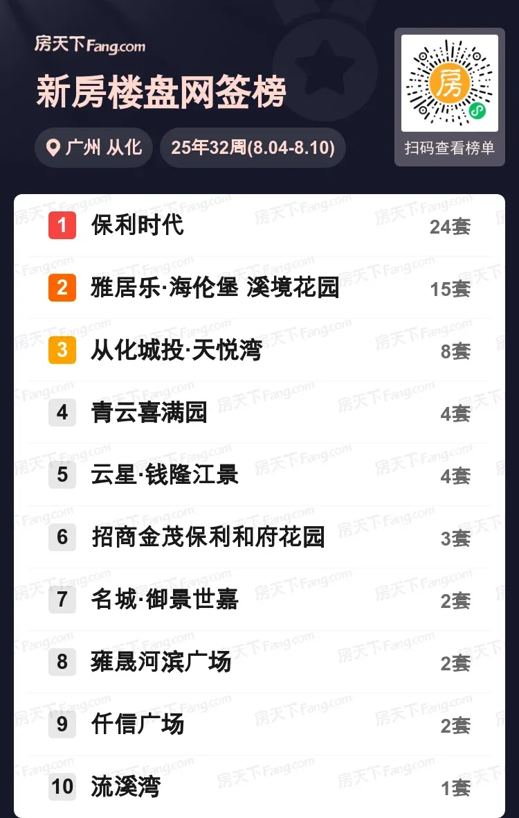 上周广州从化楼市出现明显分化,保利时代以24套成交一骑绝尘,相当于二至十名成交总和!雅居乐·海伦堡溪境花园以15套位居亚军,天悦湾8套成绩稳居第三梯队。值得关注的是,榜单后半段多个项目出现个位数成交,市场呈现冰火两重天态势。