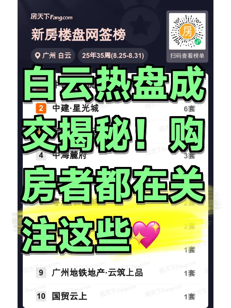 上周白云楼市表现亮眼,中铁诺德阅泷Ⅱ云臻以11套成交领跑,中建·星光城6套紧随其后,新城翡丽云境4套稳居前三。从成交分布看,江语上品苑、粤海·云港城等改善型项目持续发力,多个楼盘呈现多点开花态势。值得关注的是,单周成交超2套的项目已达半数,预计后续热门楼盘之间的产品力竞争将更加激烈。你最近在看哪个项目?快来聊聊你的选房标准吧~