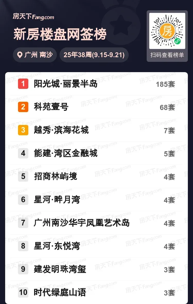 上周南沙新房市场惊现现象级热销!阳光城·丽景半岛以185套网签量一骑绝尘,是第二名科苑壹号销量的近3倍。从成交数据看,前两名楼盘占据总成交量的82%,市场两极分化明显。