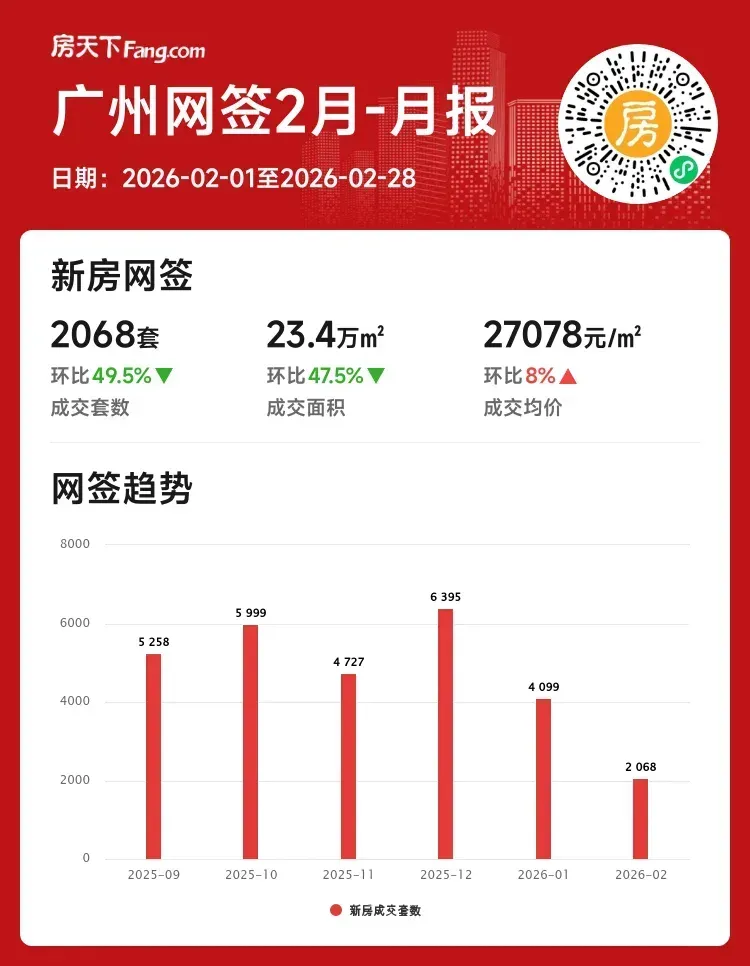 🔥 2月广州新房市场呈现"量价背离"特征:成交套数同比上月腰斩,但均价逆势上涨8%,热门板块高端项目成交占比显著提升。