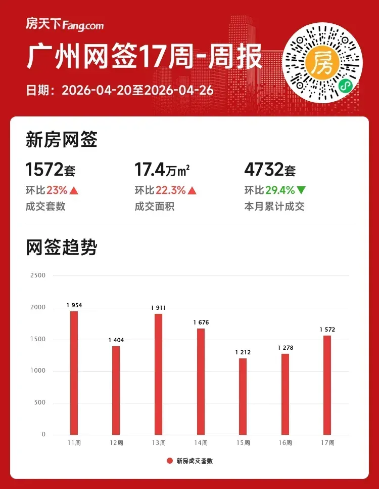 来看最新出炉的硬核数据:在2026年4月20日至4月26日的第17周,广州新房市场共成交了1572套!