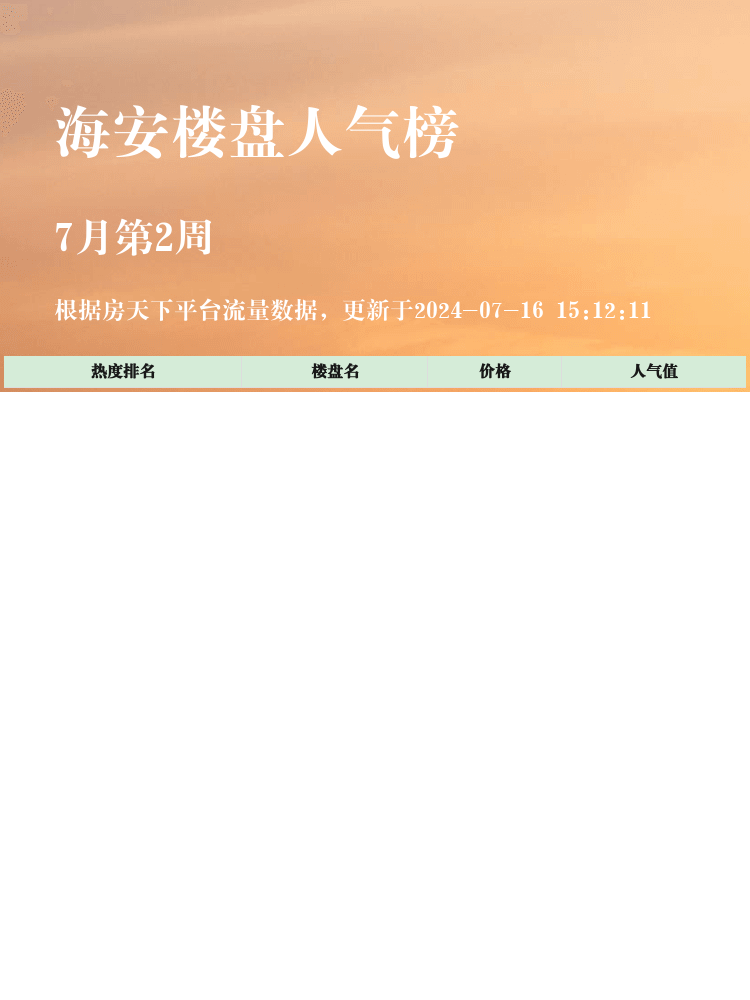 买房大作战已经成为现代都市人的必备技能之一,关注人气楼盘榜单能够帮助我们快速锁定热门楼盘📈。无论是考虑投资回报还是自住需求,了解市场上的人气楼盘都是非常有必要的。今天就为大家盘点一下海安区域的热销楼盘榜单,看看哪些楼盘最值得关注吧!🌟