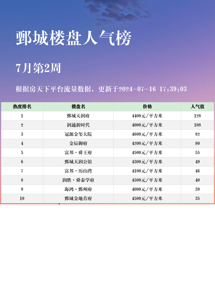 在购房的过程中,一份全面的人气楼盘榜单是非常有价值的,它能帮助购房者快速了解市场上的热门楼盘,节省大量时间。当前市场买房选房的核心逻辑是:地段、配套、户型、价格等因素综合考虑。让我们一起看看鄄城地区最受欢迎的楼盘有哪些吧!
