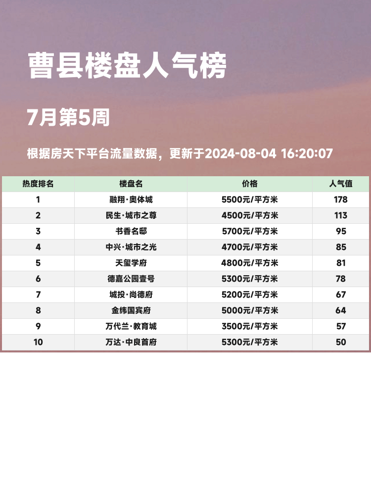 ✨大家好,今天为大家带来曹县的人气楼盘榜单!买房不仅仅是选一处居所,更是对未来生活品质的一种期望💖。在当前市场形势下,选择一个性价比高、配套设施齐全的楼盘至关重要,让我们一起来看一看这些备受瞩目的楼盘吧!