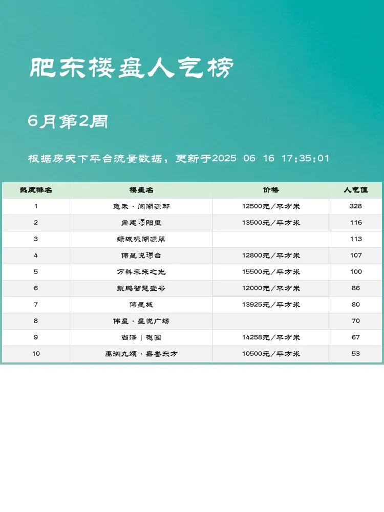 买房选房看榜单准没错!🏆人气楼盘反映市场真实热度,既能避免踩坑又能抓住高性价比机会。当前市场下,既要关注价格优势,也要看配套成熟度,更要考虑未来升值潜力~这份肥东最新榜单给你最实用的参考!