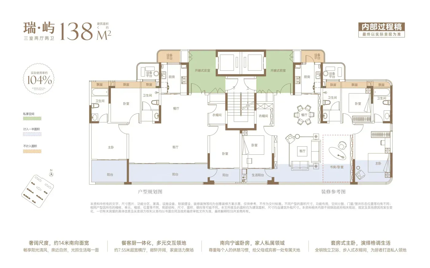 产品设计亮点突出:玻璃幕墙+干挂铝板立面提升质感,下沉式庭院会所丰富休闲场景;实际使用率最高约104%,空间利用率高,适合改善需求。但客观提醒:小区规划评分仅7.50,绿化细节需实地确认,可能影响日常舒适度。
