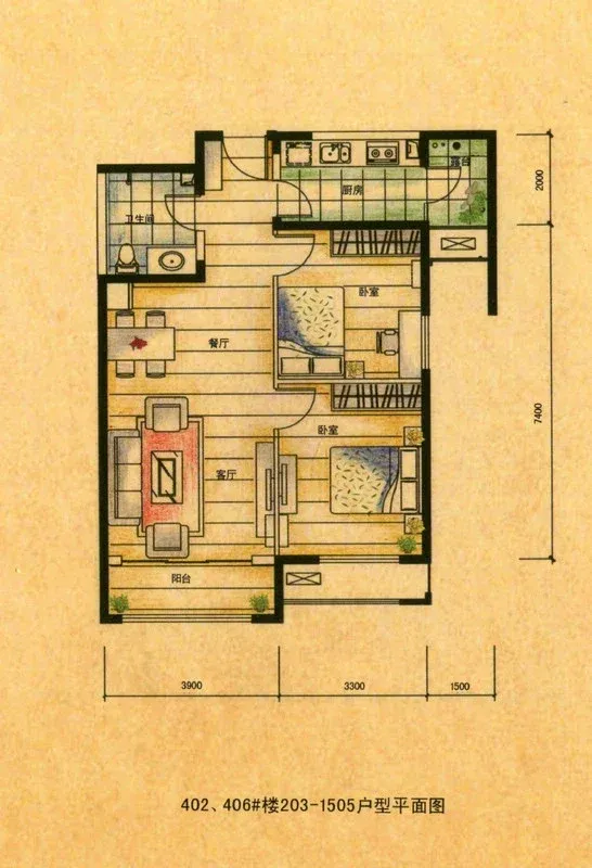户型是2室2厅0厨1卫1阳台,东南朝向