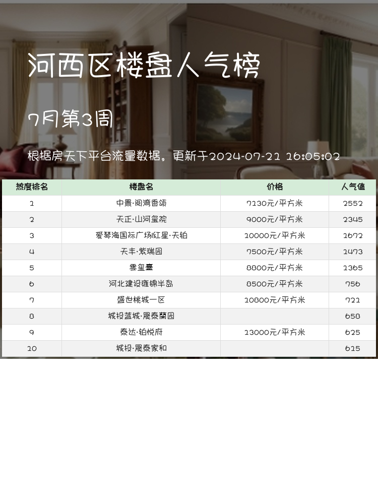 以上就是河西区人气楼盘榜单的前三名,快来看看有没有适合你的家吧!🏠✨