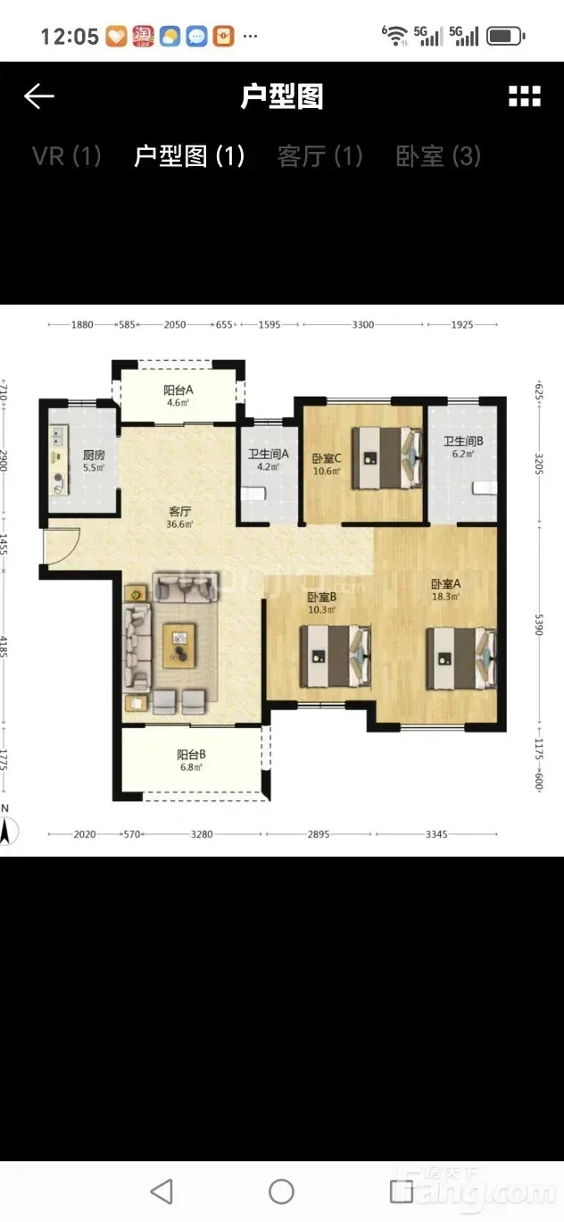 户型是3室2厅2卫,东南朝向