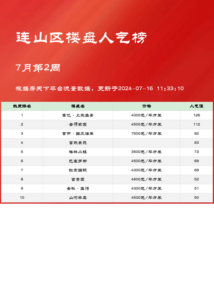🏠在选择购买新房时,人气楼盘榜单是购房者的重要参考📊。通过人气榜单,可以了解哪些楼盘受到市场的高度关注,帮助我们更好地做出决策。当前市场的核心逻辑是地段、配套和价格哪个更能满足你的需求🤔。让我们一起来看看连山区最受欢迎的楼盘吧!👇