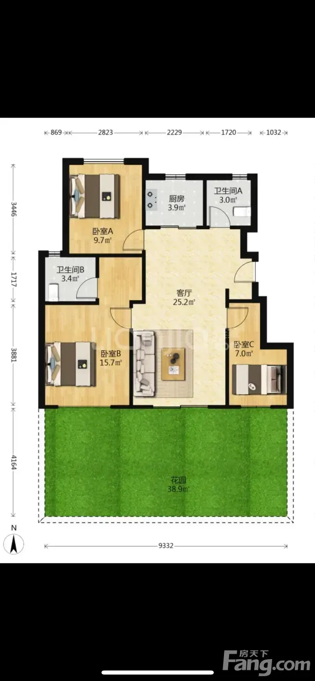 户型是3室2厅1厨2卫1阳台,南朝向