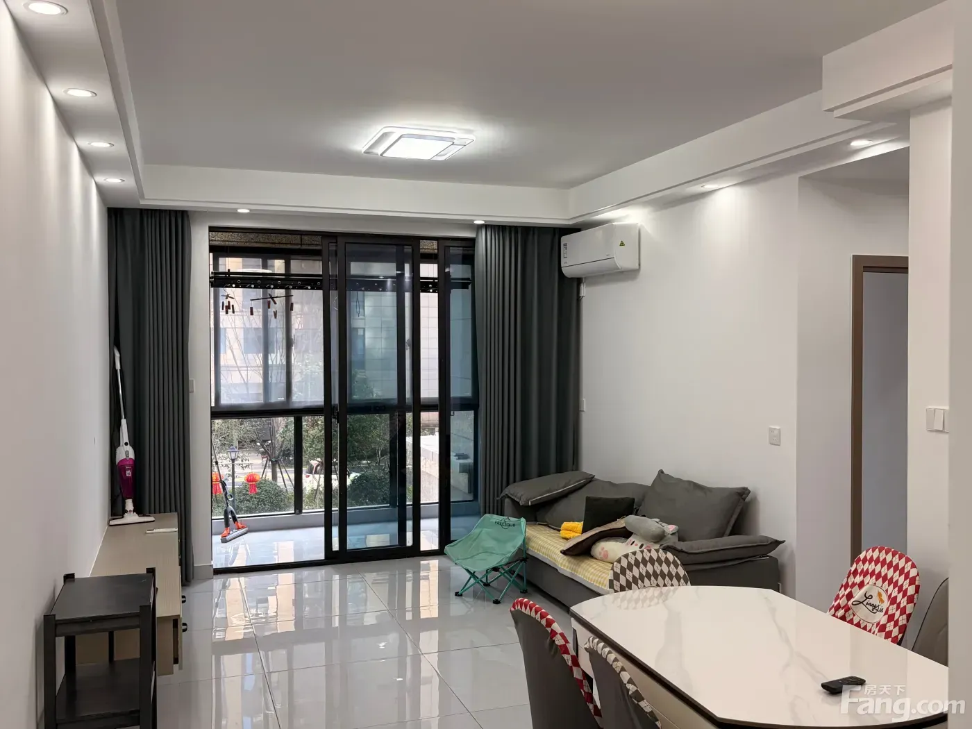 客厅采光特别好,白天都不用开灯💡。我配了灰色的布艺沙发和岩板餐桌,空调也是品牌的。厨房里冰箱、油烟机、灶具都齐全,完全可以自己做饭🍳。