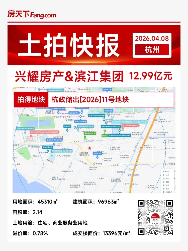 🏠 杭州,2026年4月8日土拍资讯:编号杭政储出[2026]11号地块,地块四至为东至规划道路,南至10号大街,西至规划道路,北至规划道路。用地性质为住宅、商业服务业用地,土地出让面积45310.00㎡,规划建筑面积96963.40㎡,容积率2.14,起始价12.89亿元,起始楼面价13293元/㎡。