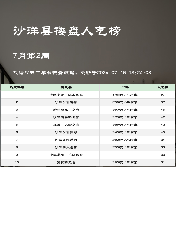 以上就是沙洋县的人气楼盘榜单前3名的详细测评,购房者可以根据自身需求和关注点进行选择。希望这些信息对你们有所帮助,祝大家都能找到心仪的家🏠!