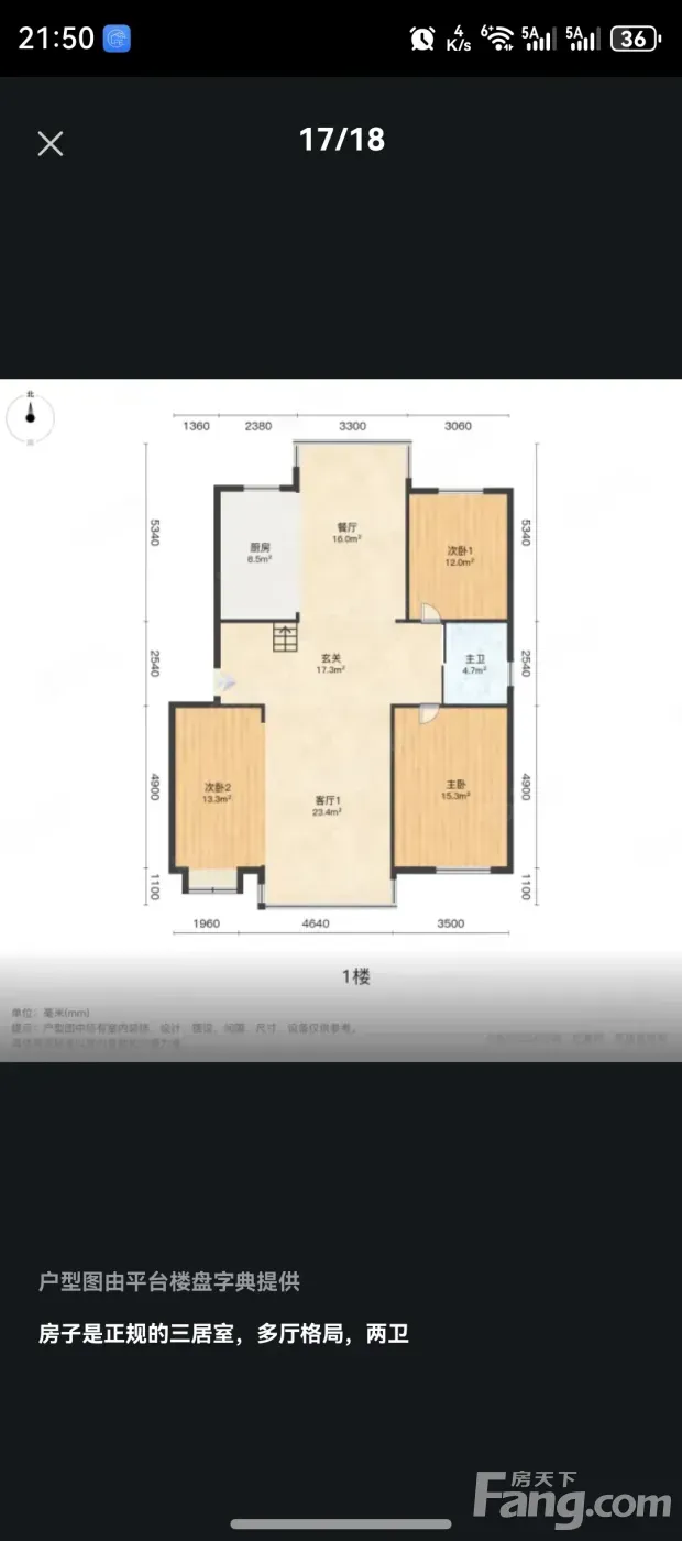 户型是3室3厅2卫,南朝向