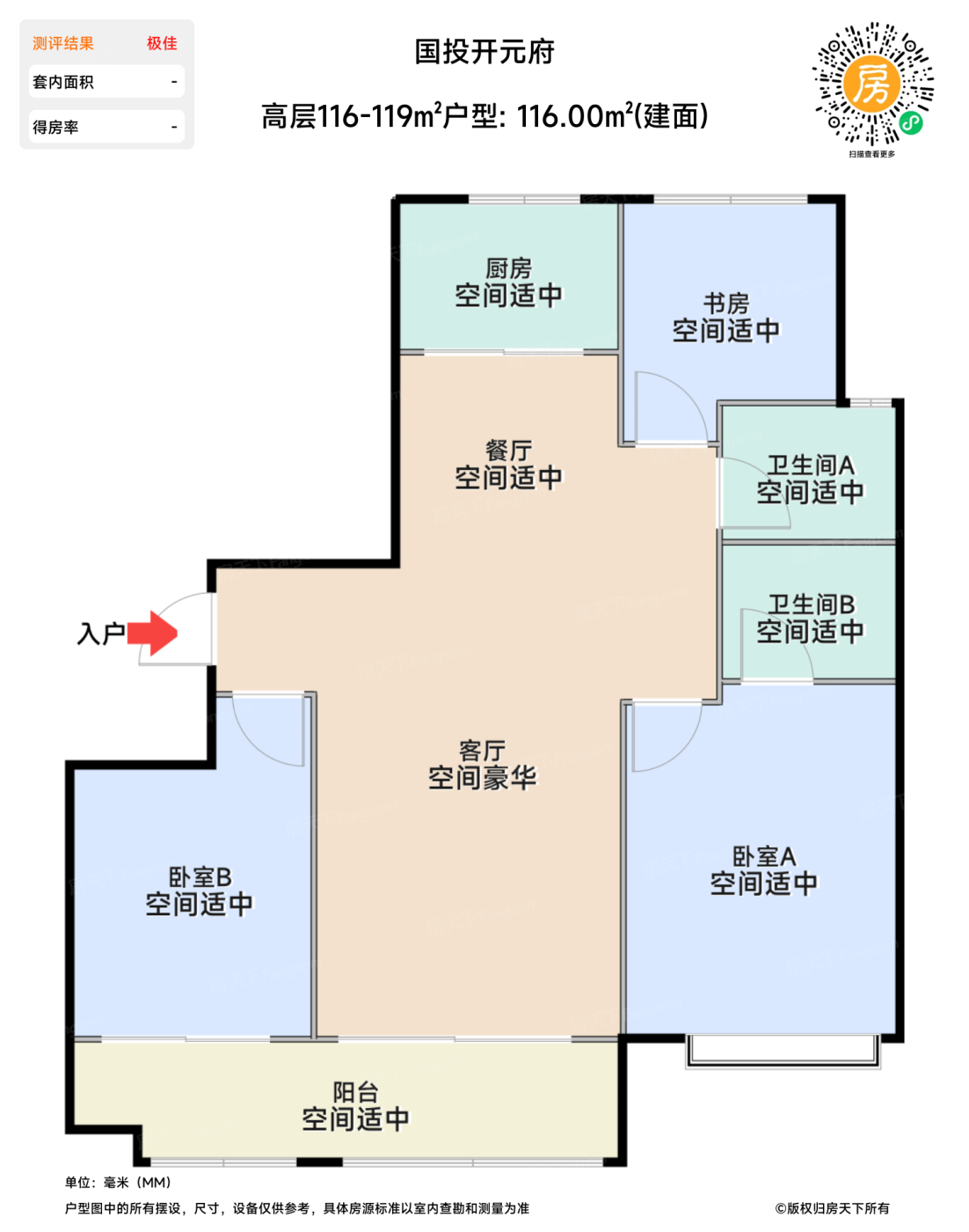 116㎡户型堪称性价比之选。南北双阳台+四开间朝南设计,实测得房率82%,主卧能摆下2米大床还带独立衣帽间。但厨房操作台面稍短,多人下厨略显局促。