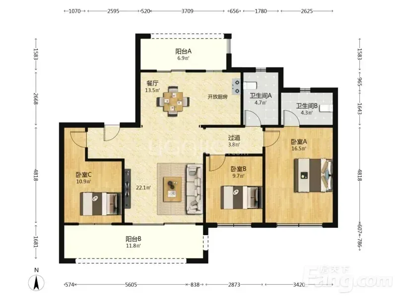 户型是3室2厅1卫,东朝向