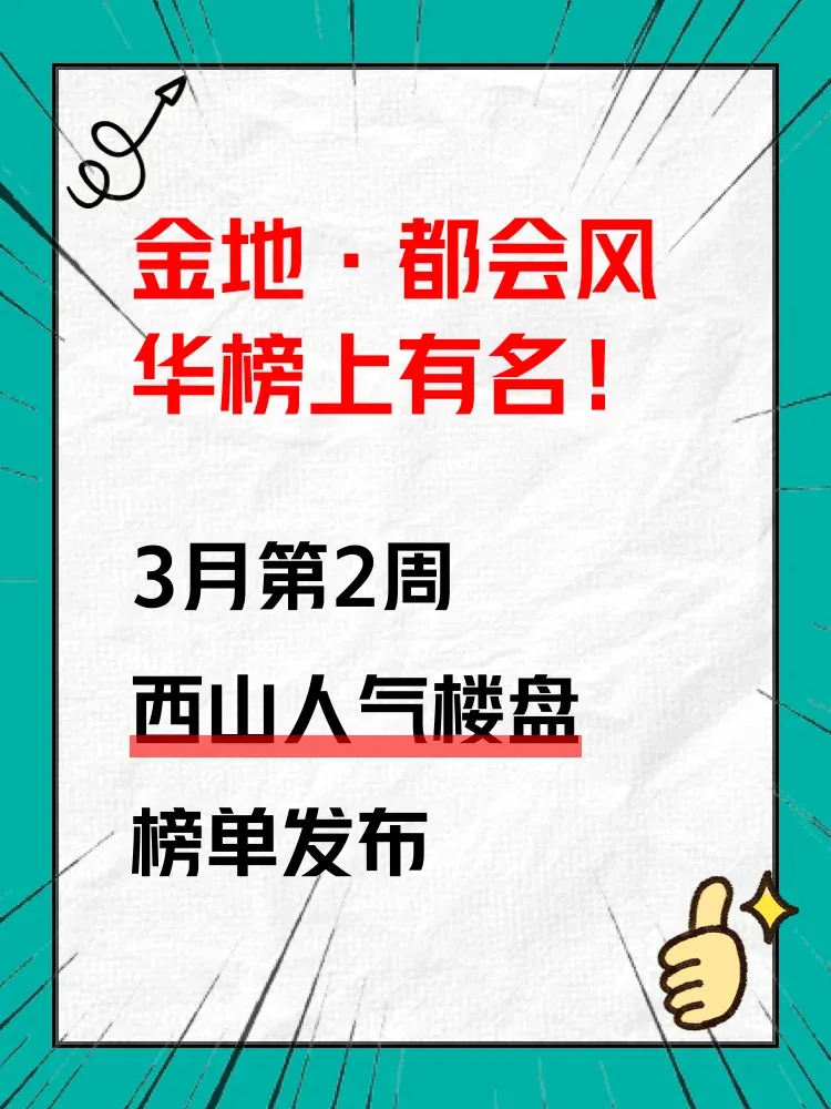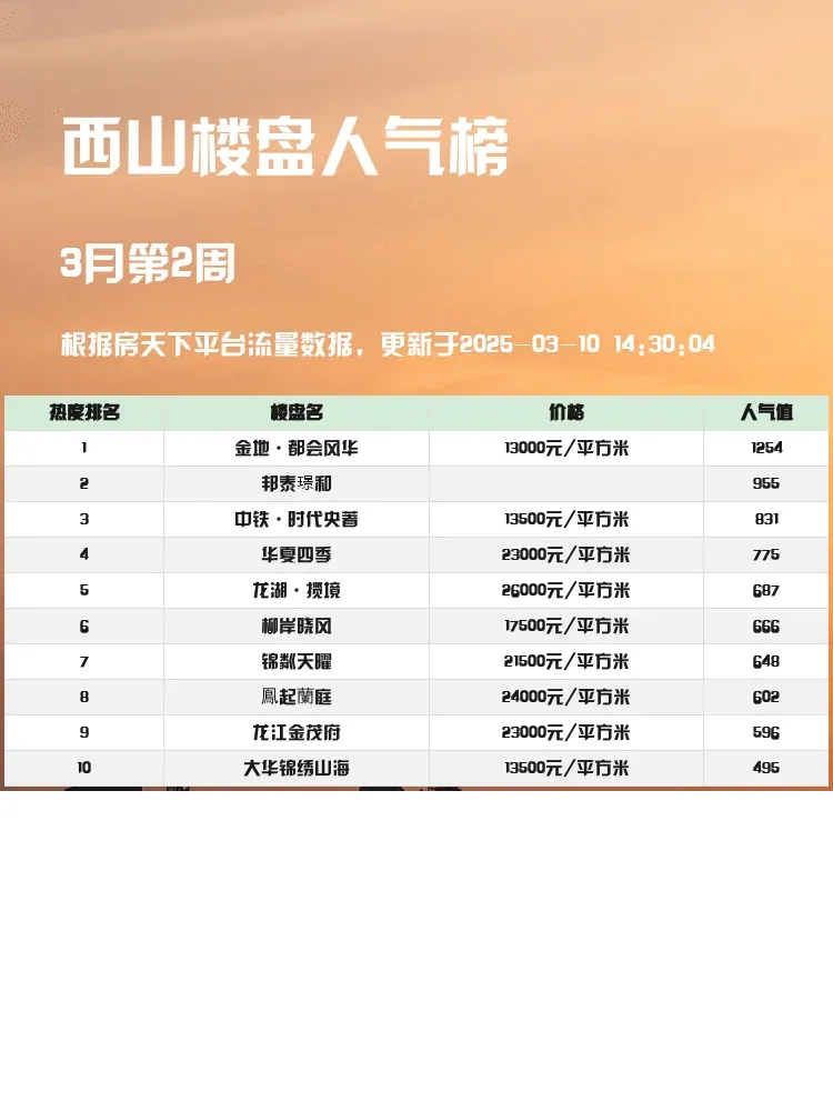 在买房这件大事上,选对区域和楼盘至关重要!🏡 西山作为热门置业区域,近期人气楼盘榜单新鲜出炉,榜单不仅反映了市场热度,更揭示了购房者的真实需求。跟着榜单选房,轻松避开“踩坑”风险,找到真正适合自己的好房子!✨
