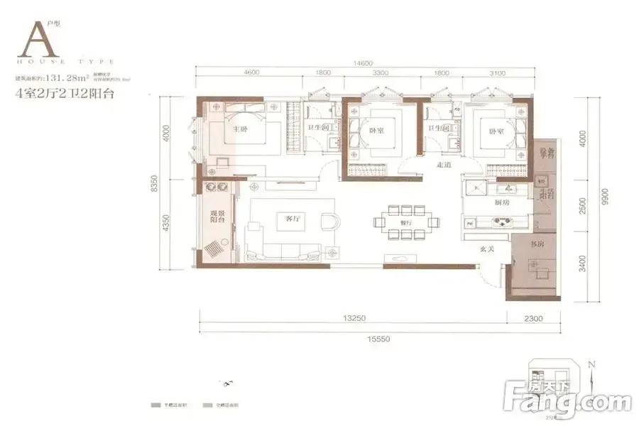 户型是4室2厅1厨1卫2阳台,东北朝向